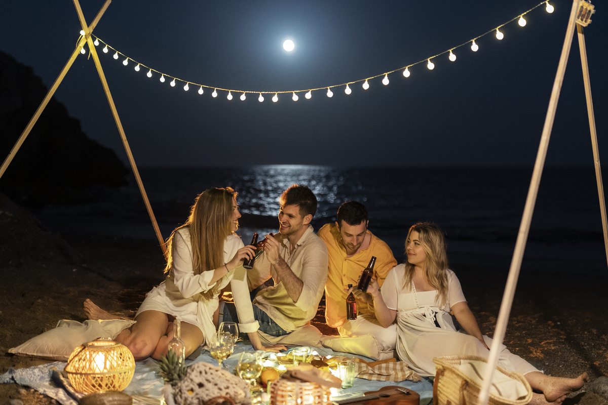 Música ao vivo ou violão, iluminação suave (como fogueira ou lanternas), petiscos e drinks refrescantes são essenciais. Também vale incluir cobertores ou esteiras confortáveis para os convidados e organizar jogos leves para animar o encontro.