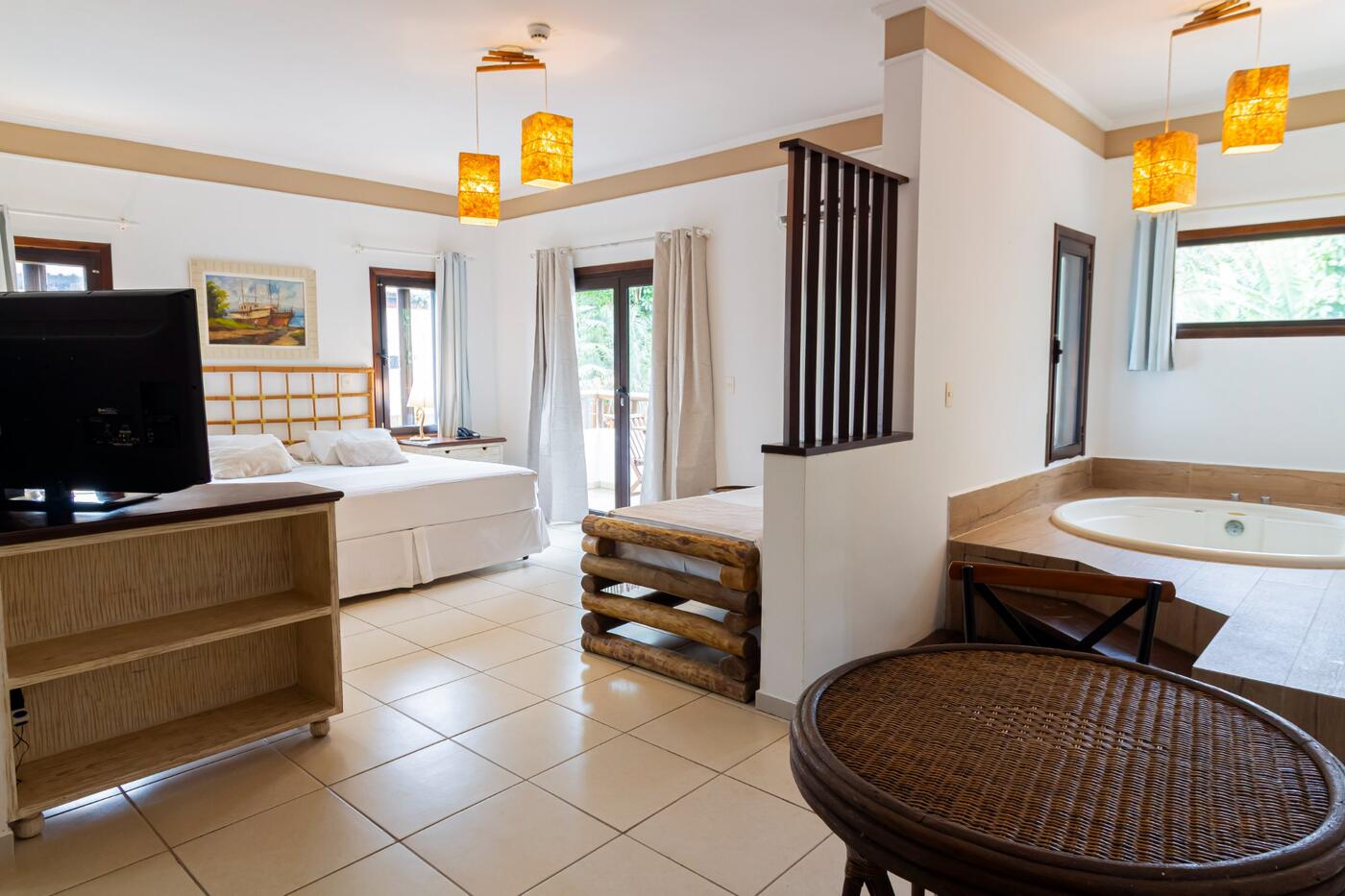 A Suíte Master é a mais completa da Porto Mare. Espaço generoso com banheira integrada ao quarto em desnível — um detalhe de design que transforma o banho em parte da experiência. Varanda privativa com vista para a vegetação, cama king, iluminação em tons quentes e acabamento em madeira nobre em cada detalhe.
